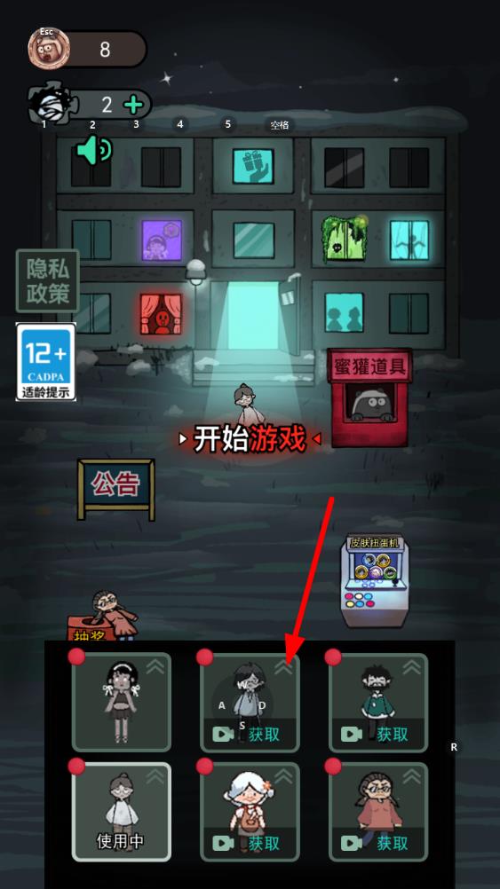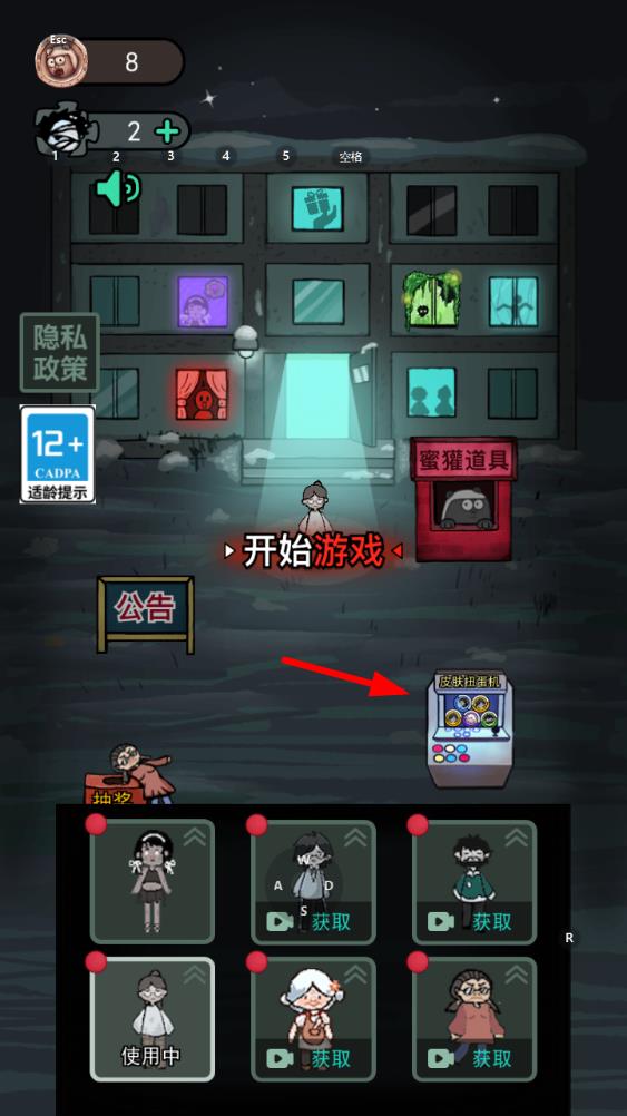 1、进入猛鬼宿舍游戏后在主界面找到下方的皮肤抽奖机区域,点开扭蛋机图标。