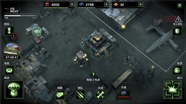 3、开始任务后,需要先设置部队部署位置,红圈内为高塔区,不能部署此处,建议观察可掠夺资源的周边建筑,计算每个障碍物的离资源点的距离,以及任务目标要求是什么,尽量完成目标以获取更多的资源,当然任务在前期都很好胜任,获得的宝箱可以开出5.56毫米机枪、MP5冲锋枪或是火炮等装备,以及等级经验,点击战队图标可查看全部武器以及设施,红色代表未获得。