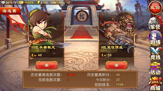 点击“参战”进入后,系统会根据当前连胜次数匹配,每次战斗后刷新两名对手;连胜可以增加积分的获取,中途失败,连胜场数也会中断哦。