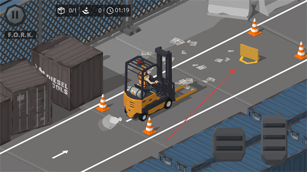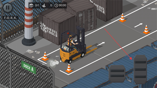 1、驾驶叉车从DOCKA出发,沿道路前往目标区域,注意躲避路锥。