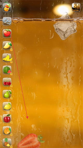 2、点击左侧草莓图标,将草莓加入饮料中,查看水果落入效果。
