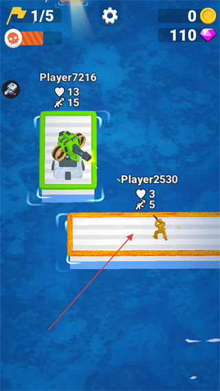 1、在木筏上与其他玩家如Player2530对战,利用武器攻击,减少对方生命值。