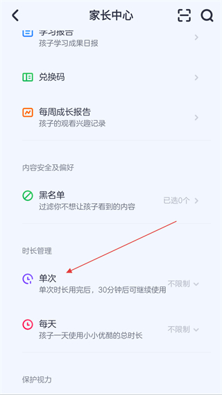 1、打开优酷少儿的APP,进入时在时长管理下点击单次的按钮。