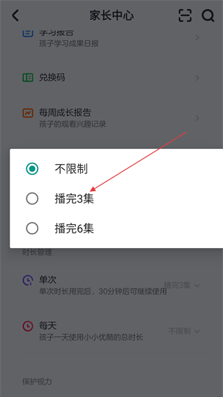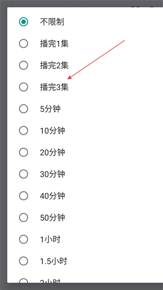 2、进入选择时间限制的页面内,选择并点击播完3集的按钮。