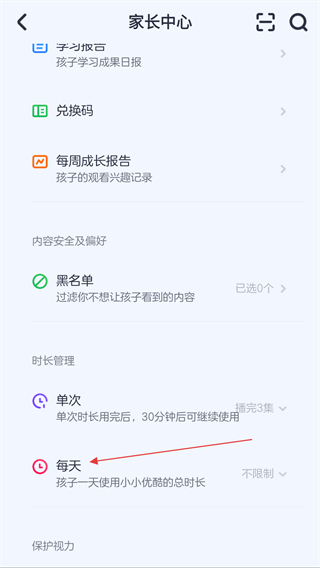 3、点击后返回家长中心,再次在时长管理下,点击每天的按钮。