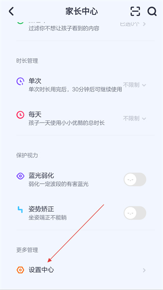 1、启动优酷少儿的应用,在家长中心的界面内找到并点击设置中心的按钮。