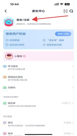 1、打开优酷少儿APP,进入到首页切换家长模式,在家长中心页面点击登录/注册的按钮。