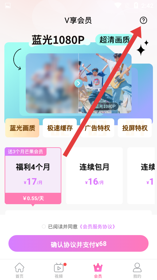 1、打开韩剧TV,点击底部会员进入V享会员页面,再点击右上角圆形问号图标。