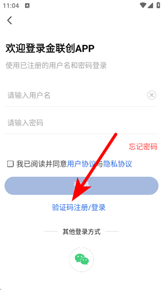 3、在登录页面,点击验证码注册/登录选项,进入验证码注册登录页面。