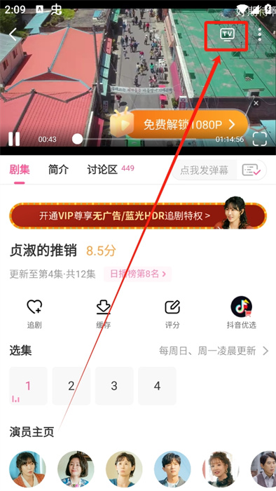 2、在播放的界面中点击右上角的小电视机TV图标进入到投屏功能之中。