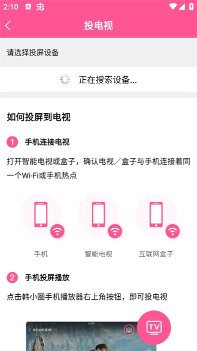 4、最后只要手机和电视的网络都在同一个无线网中,就可以搜索到设备,然后去进行投屏即可。