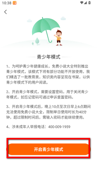 4、在青少年模式说明界面,点击开启青少年模式按钮,即可开启该模式。