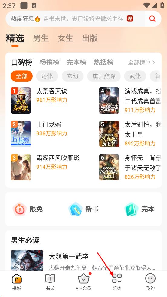 1、打开小说阅读软件,进入书城页面,点击页面下方的“分类”选项,进入分类页面。