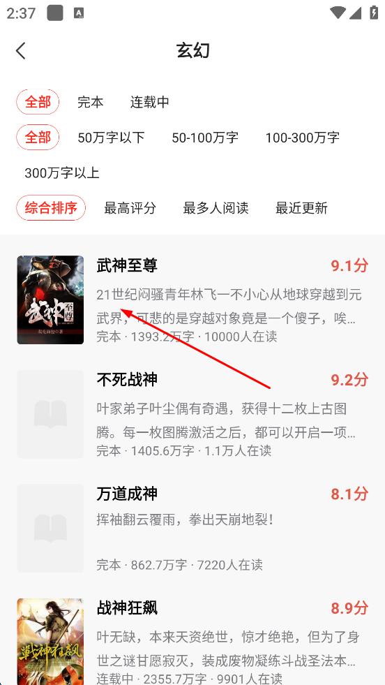 3、在玄幻小说列表页面,浏览小说列表,找到想要阅读的小说,比如“武神至尊”,点击该小说,进入小说详情页面。