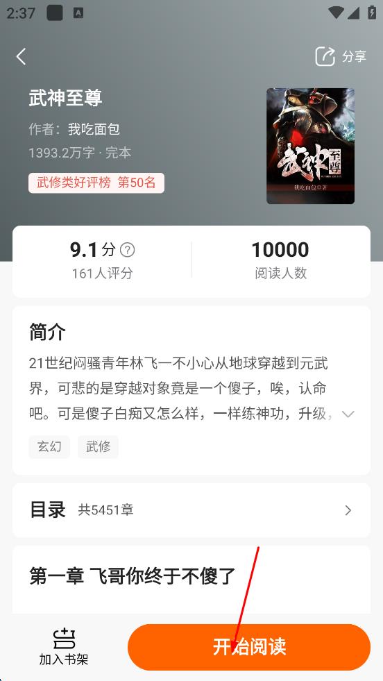 4、在小说详情页面,点击“开始阅读”按钮,即可开始阅读该小说。