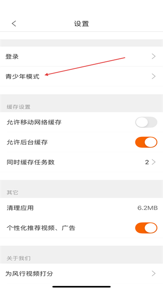 3、进入设置的页面内,点击登录下青少年模式的功能按钮。