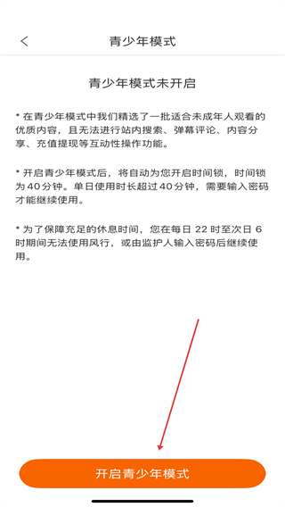 4、进入该模式的页面内,熟知青少年模式后再点击开启按钮。