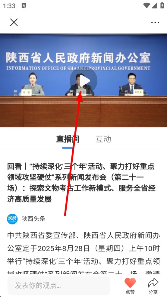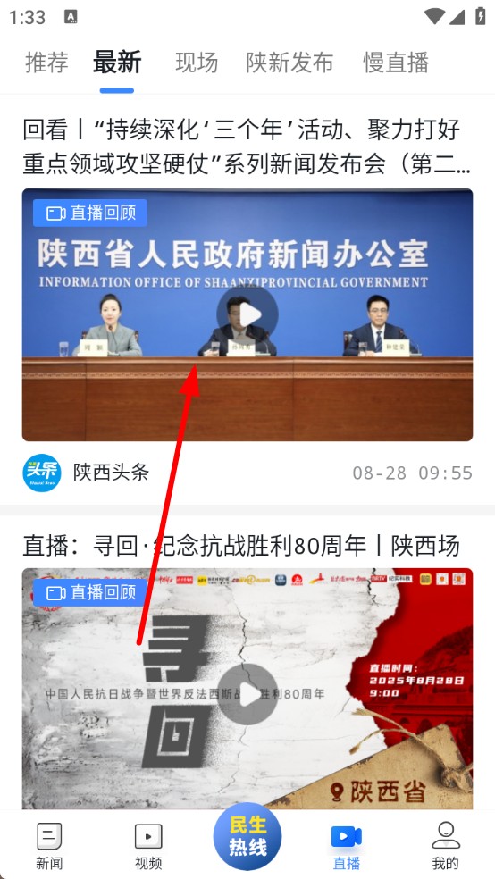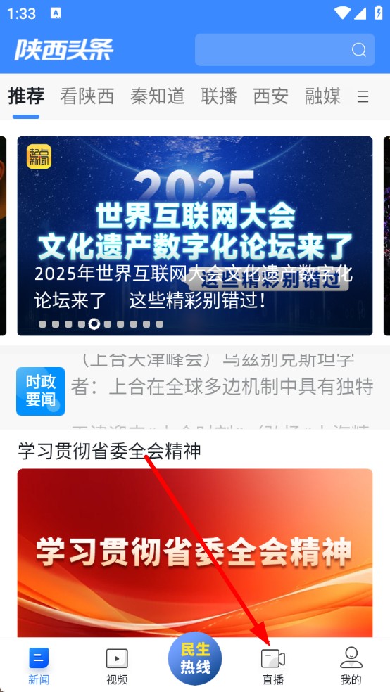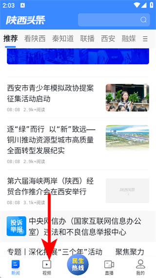 1、打开陕西头条APP,点击底部导航栏中的直播选项。