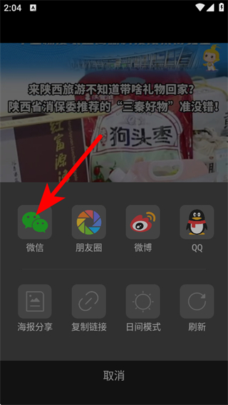 3、在分享选项菜单中,点击微信图标,进入微信分享界面即可。