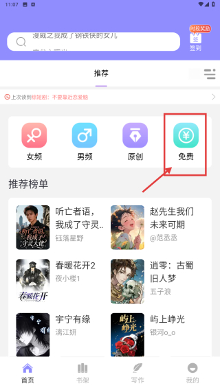 1、打开小说阅读类应用,点击免费选项,进入今日免费小说页面。