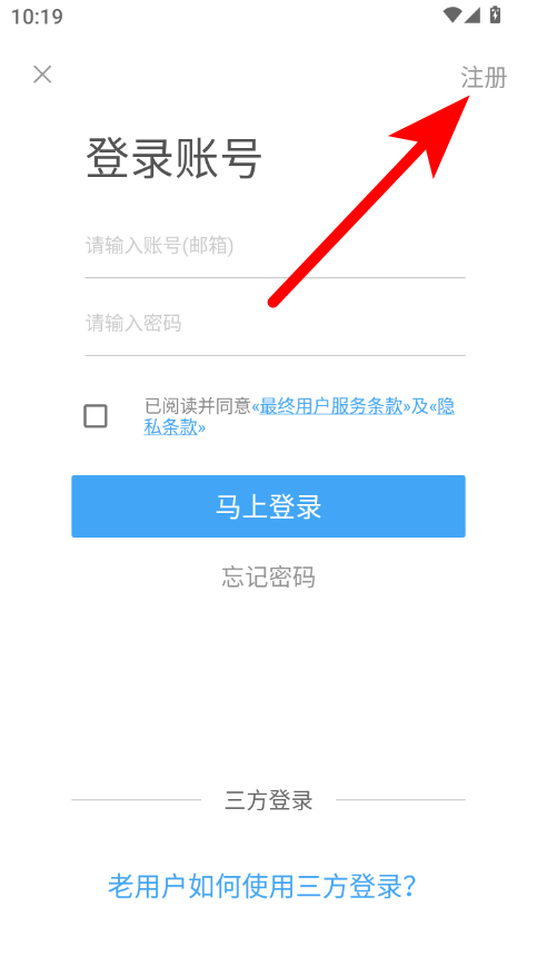 3、在登录账号页面,点击右上角注册选项,进入注册新账号页面。