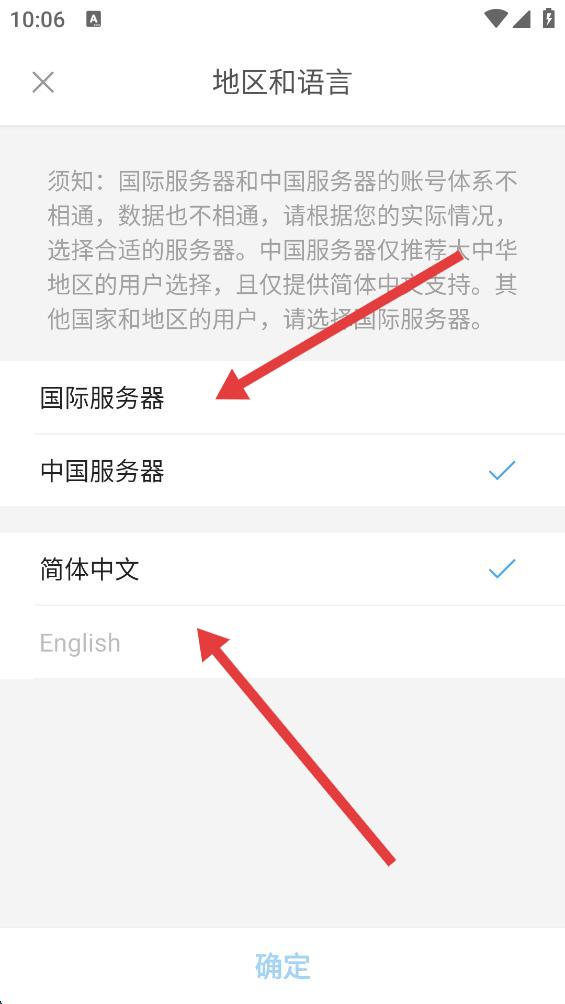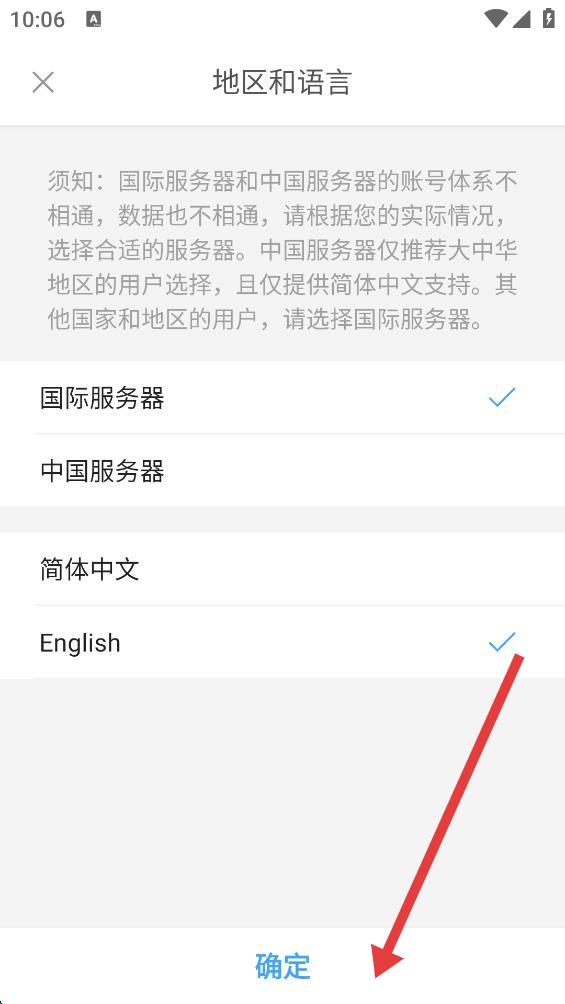 4、选好服务器和语言后,点击页面底部的确定按钮,即可完成语言切换。