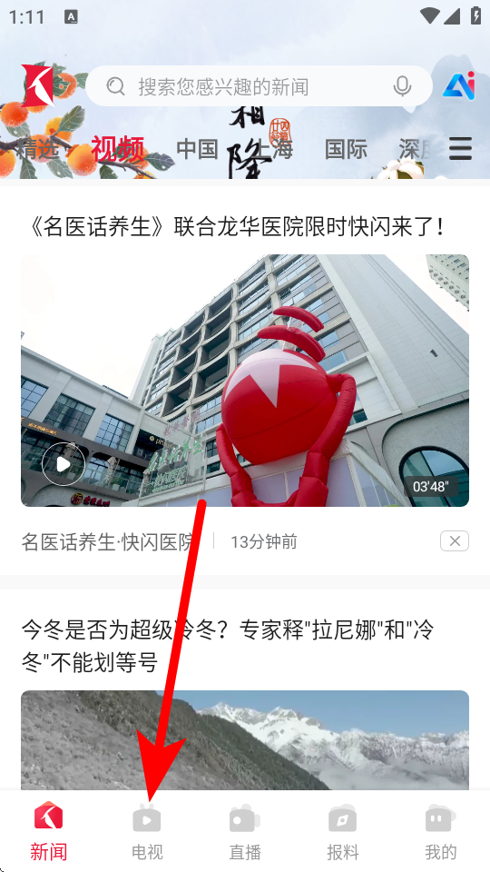 1、在看看新闻app首页,点击底部电视选项,进入电视页面。
