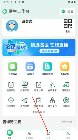 1、打开健康山西医生版APP,在首页点击底部导航栏中的头条。