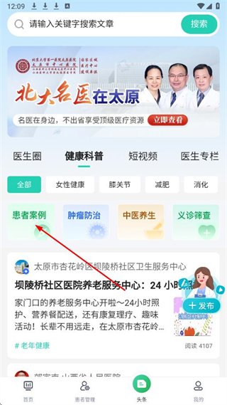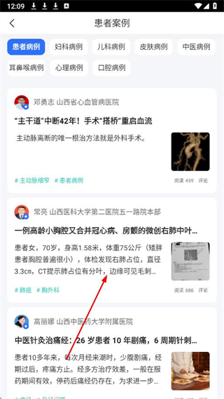 2、在头条页面,点击患者案例板块,进入患者案例分类页面。