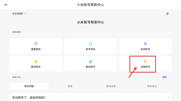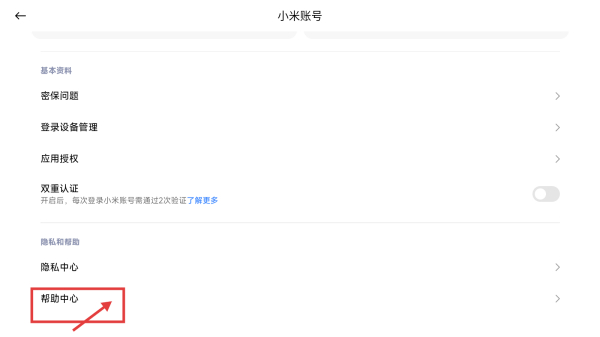 3、在小米账号页面,点击帮助中心选项,进入小米账号帮助中心页面。