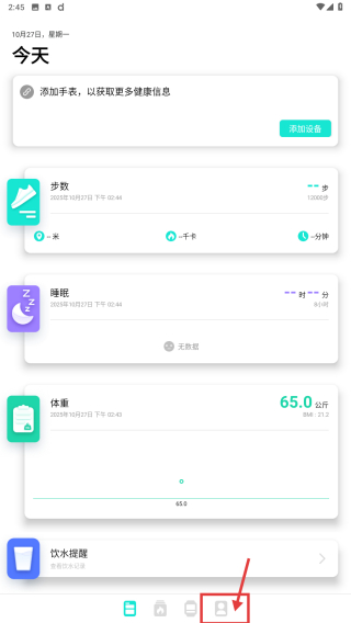 1、打开健康管理类应用,点击个人中心图标,进入个人中心页面。