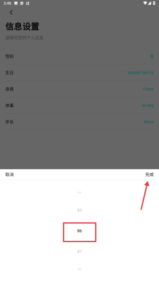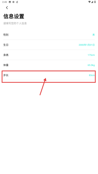 3、在信息设置页面,点击步长选项,进入步长选择页面。