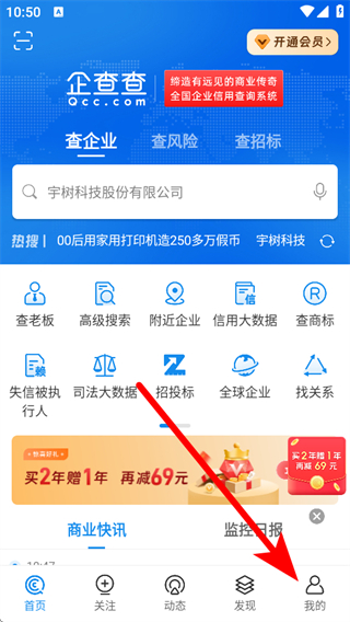 1、打开企查查APP,点击底部导航栏的我的,进入个人功能页面。