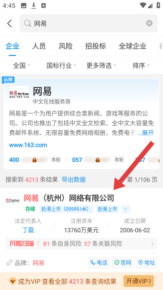 1、打开企查查APP,在首页搜索栏输入自己需要查询的企业名称如网易杭州网络有限公司,点击搜索启动查询。