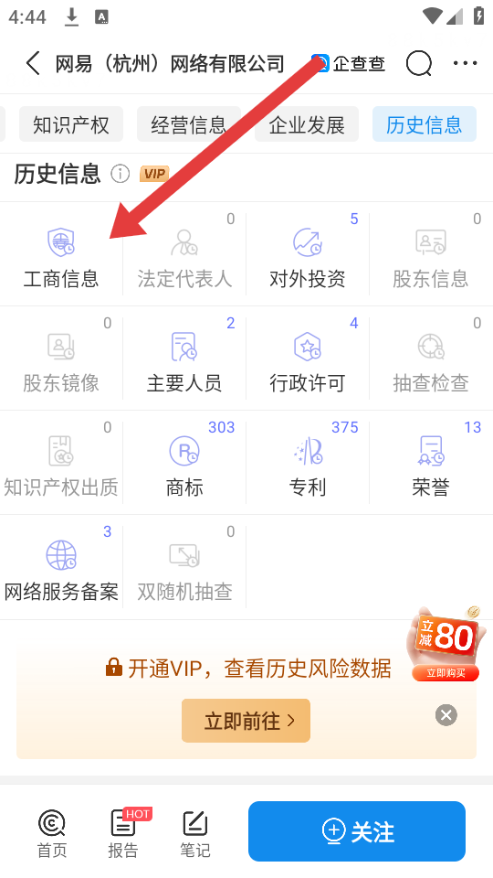 3、在企业详情页切换至历史信息板块,找到最底下的工商信息,查看企业营业执照登记的注册资本、法定代表人、成立日期等核心信息。