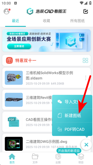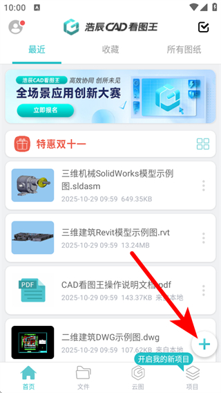 1、打开浩辰CAD看图王APP,点击右下角项目栏的+号,展开功能菜单。