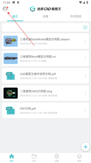 1、打开浩辰CAD看图王APP,点击界面左上角的头像图标。
