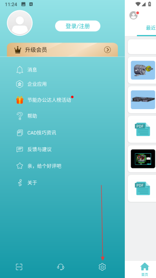 2、在弹出的侧边栏中,点击底部的设置图标,进入设置页面。