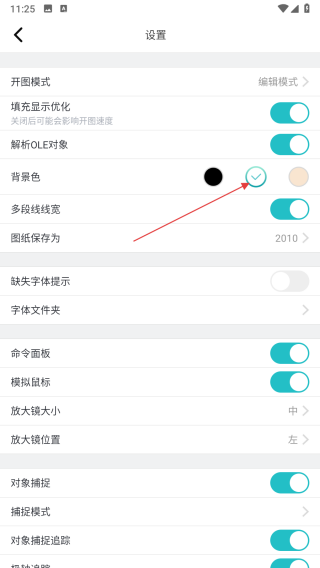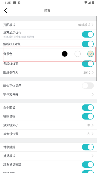 3、在设置页面里,找到背景色选项,此时能看到背景色有黑色、白色等可选择。