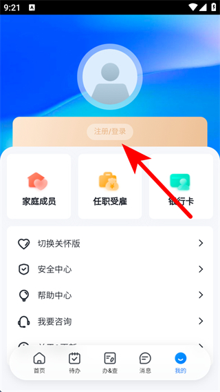 2、在个人功能操作页面,点击注册/登录的区域,进入登录大点界面。