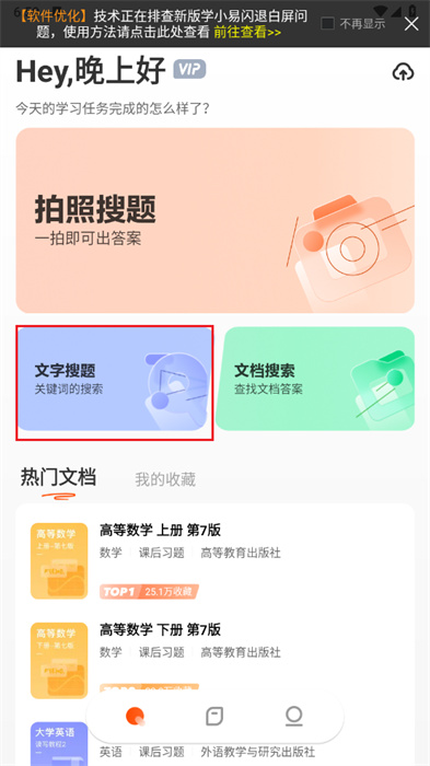 1、进入应用之中后,可以点击【文字搜题】栏目,以进行文字型题目的搜索;