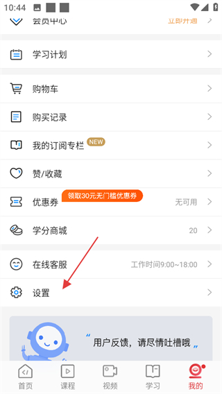 2、在个人中心页面,滑到底部,点击设置可进入设置页面。