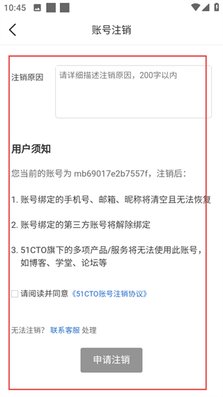 4、在账号注销页面,填写注销原因并同意协议后点击申请注销可完成注销。