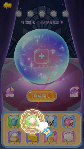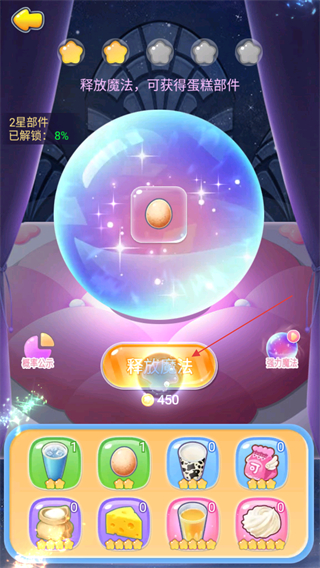 4、点击释放魔法按钮,消耗资源制作蛋糕部件,解锁不同星级的部件以提升蛋糕品质,推进游戏进程。