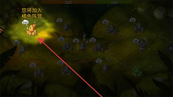 1、加入橘色阵营,操控橘色蘑菇建筑,积累兵力。