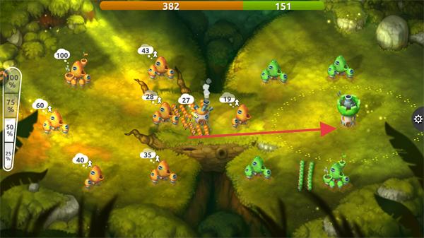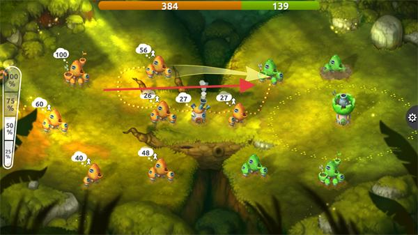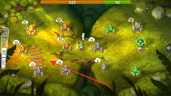 2、派遣橘色蘑菇兵力,进攻敌方灰色蘑菇建筑,扩大领地。