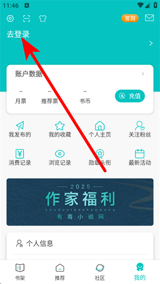 2、在个人中心界面,点击去登录选项,进入有毒账号登录页面。
