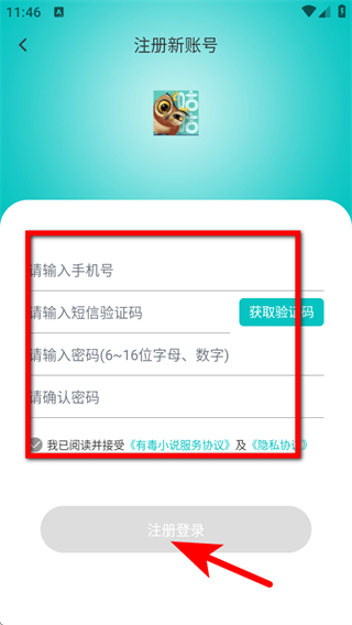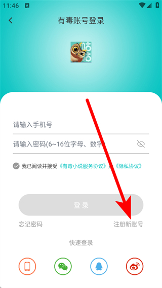 3、在有毒账号登录页面,点击注册新账号选项,进入注册新账号页面。