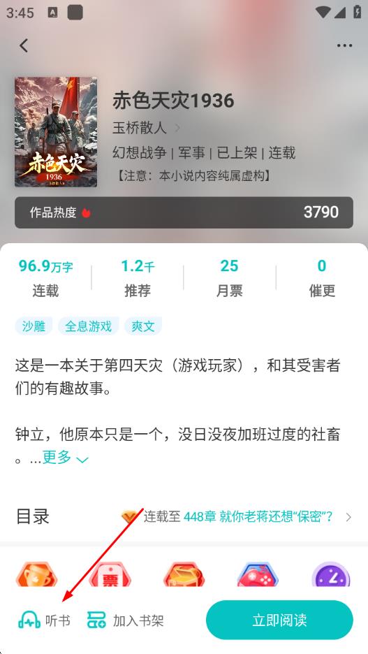 1、打开有毒小说App,在推荐页面找到想要听的小说,点击进入小说详情页。
