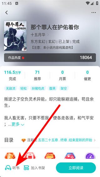 4、在小说详情页面,点击听书按钮,即可开始收听该小说。
